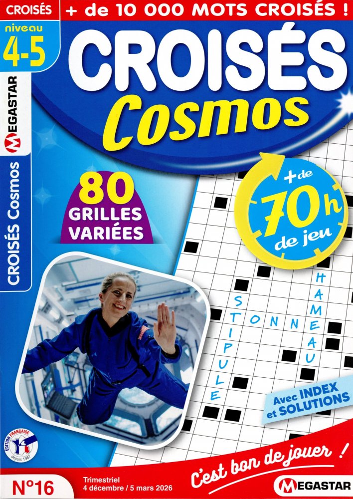 Cosmos niveau 4/5 est fait pour vous ! Ses définitions de niveau moyen et difficile et ses grilles de formats variés vous assureront des moments de jeu intenses et stimuleront votre réflexion. Son grand format et sa mise en page claire et lisible sont des atouts appréciables, vous procurant un réel confort de jeu.